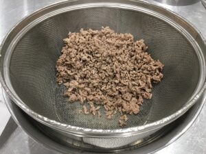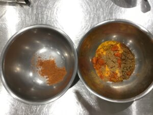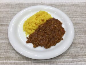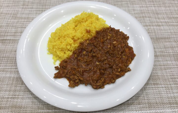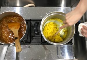 キーマカレーはまず野菜をコンカッセ(粗みじん切り)にします。ひき肉を炒めたら、丁寧に油をきって、炒めた野菜とスパイスとひき肉をブイヨンで煮込んだら出来上がり!「キーマ」はヒンディー語で「細かいもの」や「挽肉」という意味なんですよ。ターメリックライスは洗米せずそのままバターで炒めたあと文化鍋でブイヨンと一緒に炊きこみました。ターメリックライスは香り豊かで美味しそう!