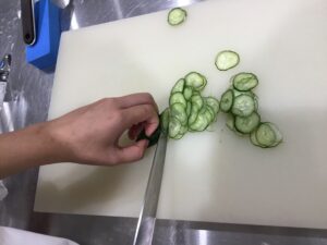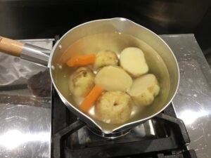 ポテトサラダのジャガイモと人参は水から茹でていきます。それから野菜は食べやすいようにカットします。すべての野菜を冷まして、マヨネーズと塩、こしょうで味を調えたら出来上がりです。写真のなかでキュウリを切る時の左手はちゃんと猫の手になっていますね!