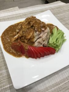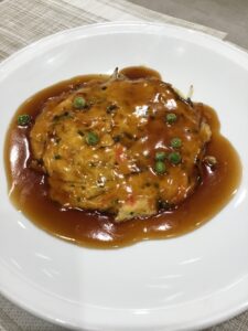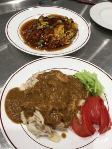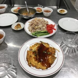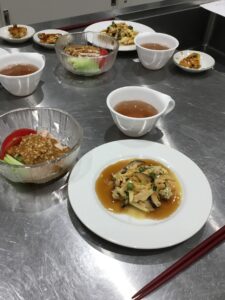 中国料理の調理実習で芙蓉蟹(かに玉)と棒棒鶏(蒸し鶏冷製 四川辛子胡麻ソース)を作りました。