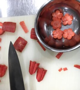 「先生、もう一度、梅人参の切り方を教えてー!」と、先生を呼ぶ声があちらこちらから聞こえてきます。