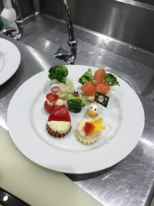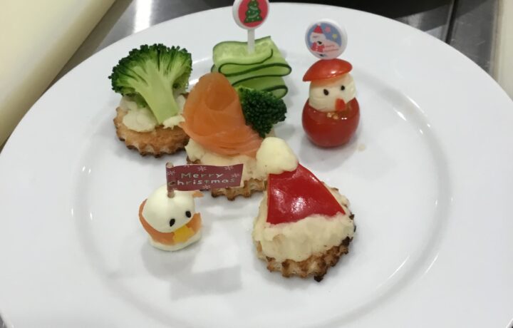 体験授業の後は給食室にてご自身で作られたピンチョスとクリスマスの特別ランチタイム!