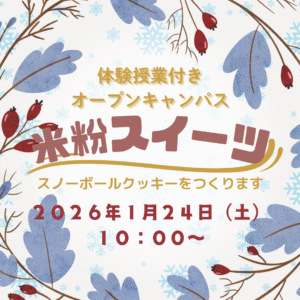 次回の体験授業付きオープンキャンパスは米粉で作るスノーボールクッキー⛄