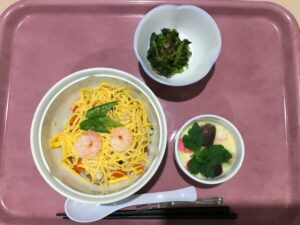 そこでちらし寿司は温蔵庫で蒸し寿司風に温めて、熱々の茶碗蒸しと菜の花の和え物を添えて、ひなまつりの行事食をいただきました!